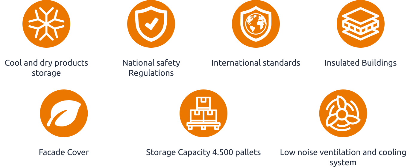 Our facility provides employment to 100+ team members and can store up to 4,500 pallets. Our entire storage facility is set up according to international working standards and includes storage space for both cool and dry products. The customized designed low noise ventilation and cooling system, isolated roof and facade cover ensures that all products are properly stored according to national safety regulations.